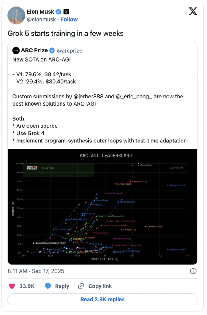 📌 What’s happening: Musk is dripping Grok 5 details like a staged preview. Training is set to kick off in weeks, launch is eyed for year-end, and he claims it could reach AGI. This time the talk feels precise—bigger datasets, tighter training cycles, and hardware muscle few rivals can match.